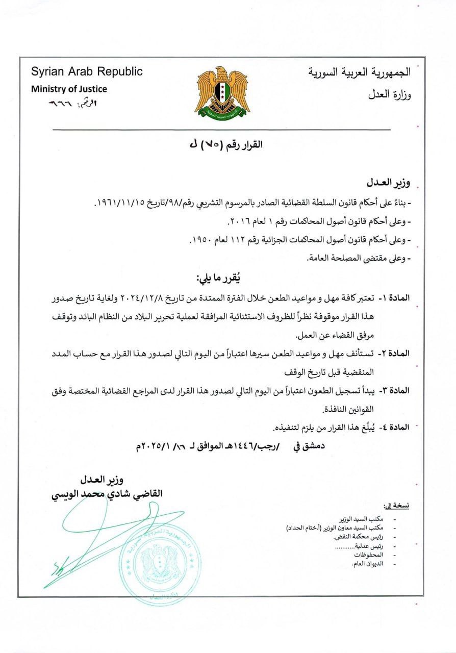 أصدرت وزارة العدل قرارًا بإيقاف جميع مهل ومواعيد الطعن من 8 كانون الأول / ديسمبر 2024 حتى تاريخ صدور هذا القرار، بسبب الظروف الاستثنائية المرتبطة بتحرير البلاد وتوقف القضاء عن العمل، وتُستأنف المهل اعتبارًا من اليوم التالي لصدور القرار مع احتساب المدد المنقضية قبل التوقف، ويبدأ تسجيل الطعون لدى المراجع القضائية المختصة وفق القوانين النافذة.