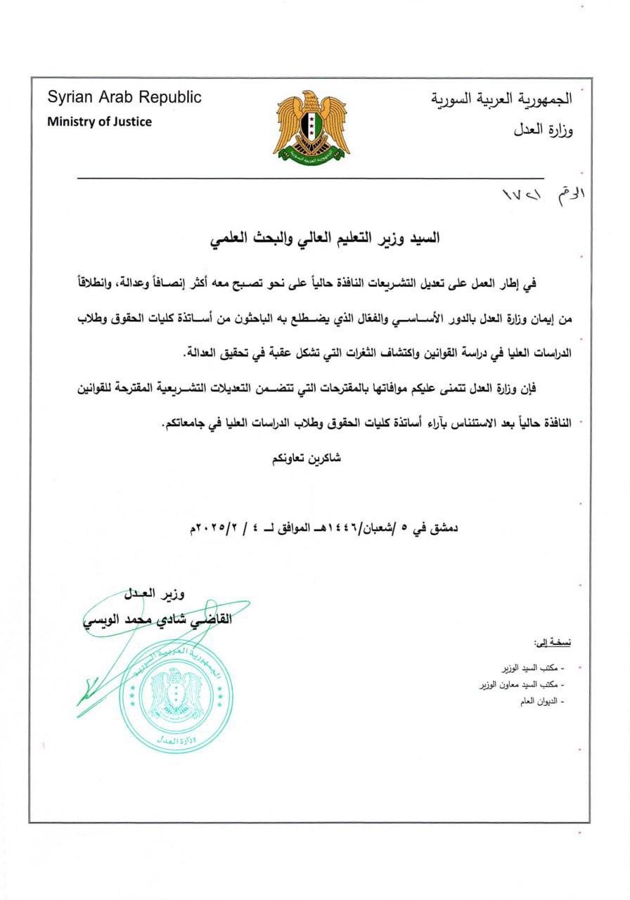 وجهت وزارة العدل كتبًا إلى وزارة التعليم العالي ومحكمة النقض وإدارات التفتيش والتشريع والنائب العام ونقابة المحامين، تطلب فيها مقترحات لتعديل القوانين النافذة، مستندة إلى آراء الأكاديميين والقضاة والمحامين، بهدف معالجة العقبات وتحقيق عدالة وفعالية أكبر.